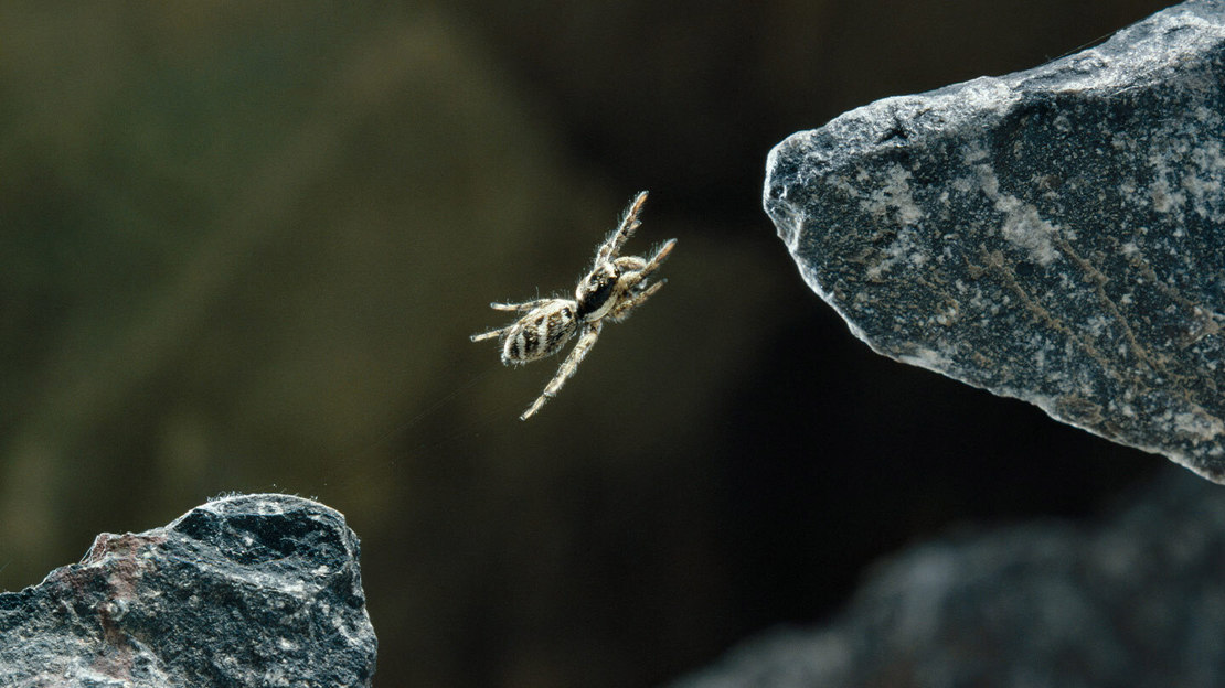 The zebra jumping spider attaches a line of silk to its perch and reels it out as it jumps. If it doesn’t make it, the spider uses the silk to clamber back to its starting point – much like a bungee jump!