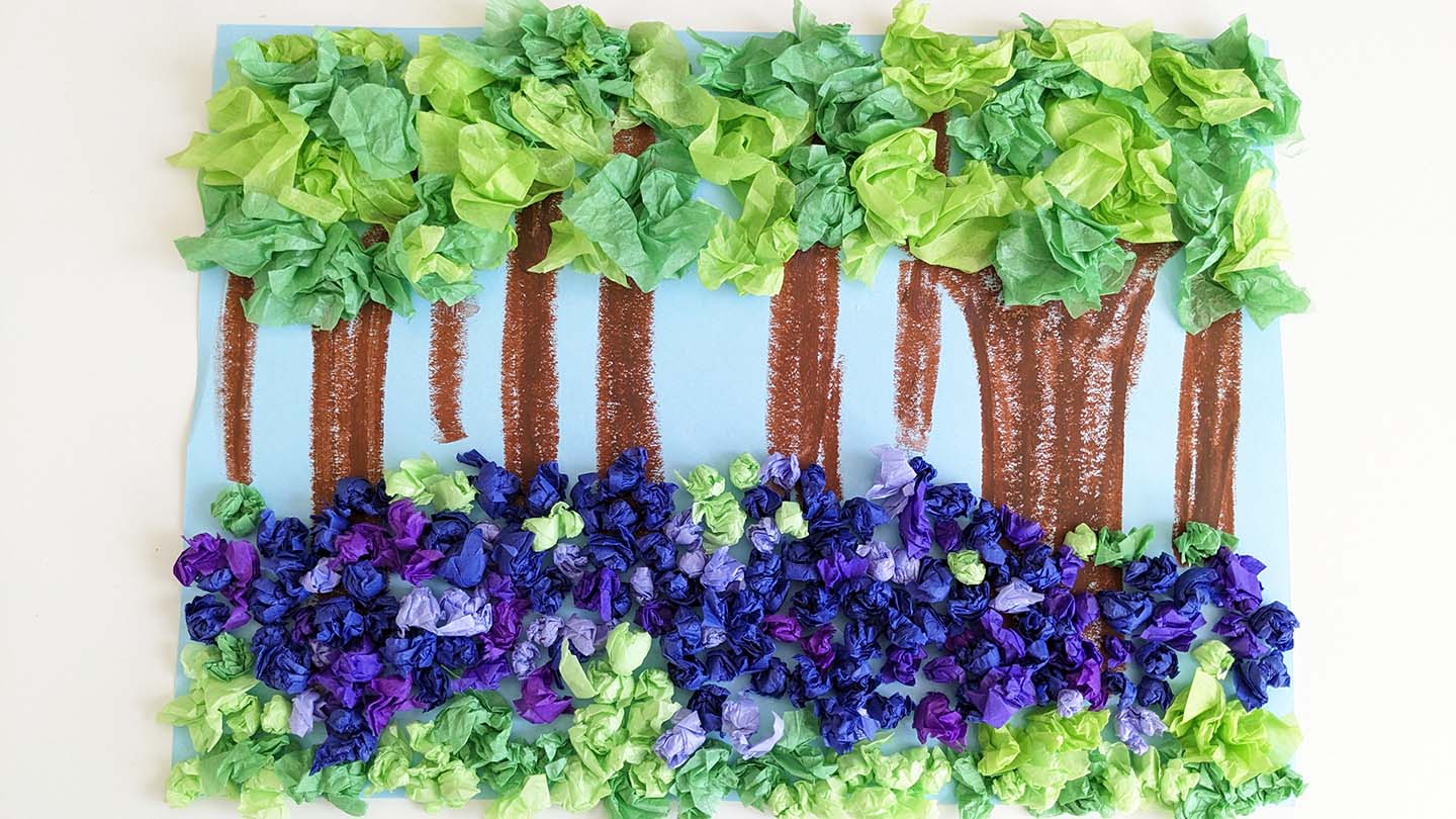 - To make a woodland scene, start by drawing tree trunks along the middle of your card. Glue green tissue paper around the top of the trunks and fluff it up to create a leafy canopy. Glue purple tissue paper around the base of the trunks, interspersed with bits of green, to create a thriving woodland floor.
