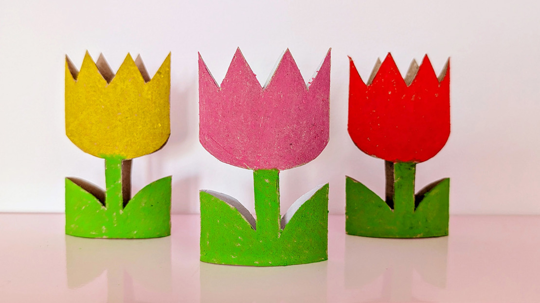 Use paints, colouring pens or crayons to colour in the flower heads and stems. - Finish your tulips by opening up the tubes slightly so they stand on their own. They’ll look fantastic alongside other spring decorations.