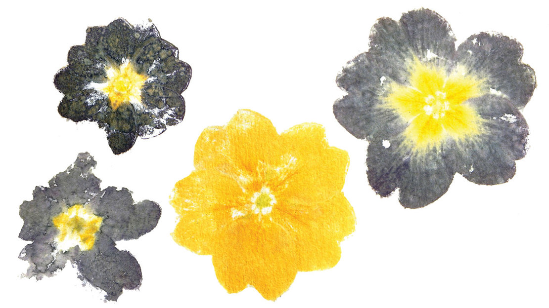 Did you know you can make exciting prints by pounding petals and leaves? They are full of juicy sap and pigment (colour), which is released when you crush them onto paper. Some work better than others, so grab a hammer and start experimenting.
