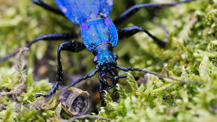 Thanks to their chewing mouthparts, beetles have incredibly varied diets. While 7-spot ladybirds munch on aphids, stag beetle larvae rely on rotting wood, sexton beetles prefer decaying animals and blue ground beetles prey on enormous slugs such as the ash black.