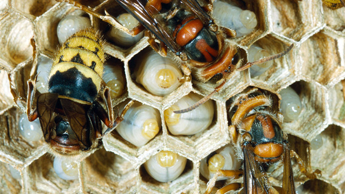 As social wasps, hornet’s lives revolve around the nest. Workers build large paper-like nests out of masticated wood and organic materials in dark and sheltered areas, such as hollow trees. Only queens of healthy colonies produce fertile eggs which are cared for by female workers. Over the year the workers maintain the hive while the queen lays eggs. Towards the autumn, the queen lays males (drones) and fertile queens, which leave the nest to mate and establish new colonies.