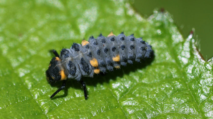 Both adults and larvae feed predominantly on aphids. They do eat other small insects too, but their appetite for aphids make them a favourite with gardeners. A ladybird can munch through 5,000 aphids during its year-long life.