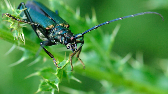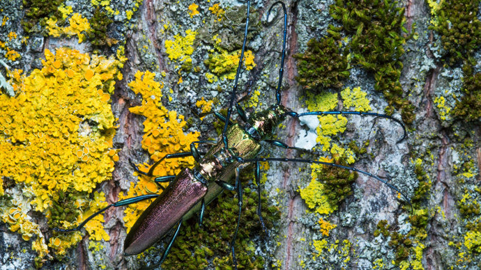 Aromatic and iridescent. Spot this musk-scented longhorn beetle glimmering on the trunks of trees.