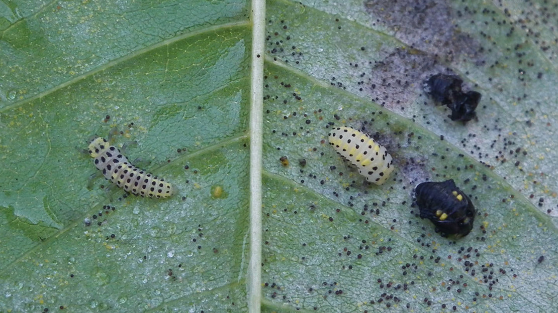 Larvae: are small and yellow-white. They have light yellow vertical stripes and black spots along their bodies.