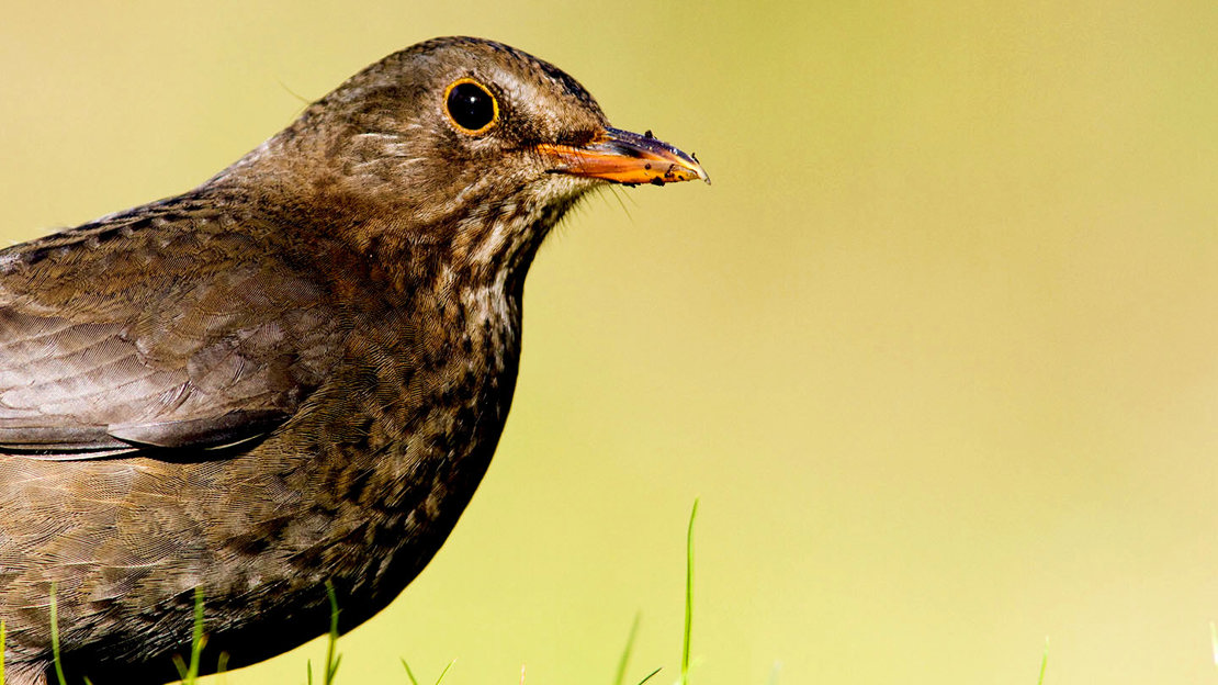 As the name suggests, male blackbirds are entirely black in colour. Females, however, are actually dark brown, with lighter brown streaks on the breast. Juveniles look similar to the fully-grown female but have copper streaks. Males have a bright yellow bill and distinctive yellow eye ring. Females have a duller, yellow-brown beak.