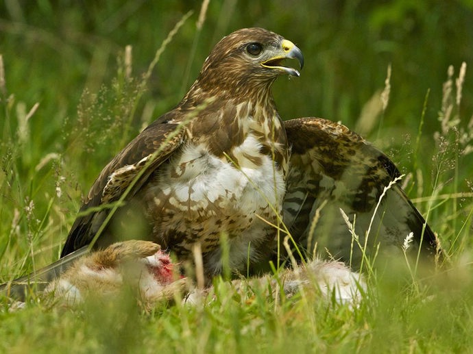 Buzzards are opportunistic predators and can take a wide variety of prey. Small rodents such as voles and mice are commonly eaten, but they can also take prey as large as rabbits or as small as earthworms. They will also scavenge on road kill. This flexible diet allows the buzzard to survive in a variety of habitats.