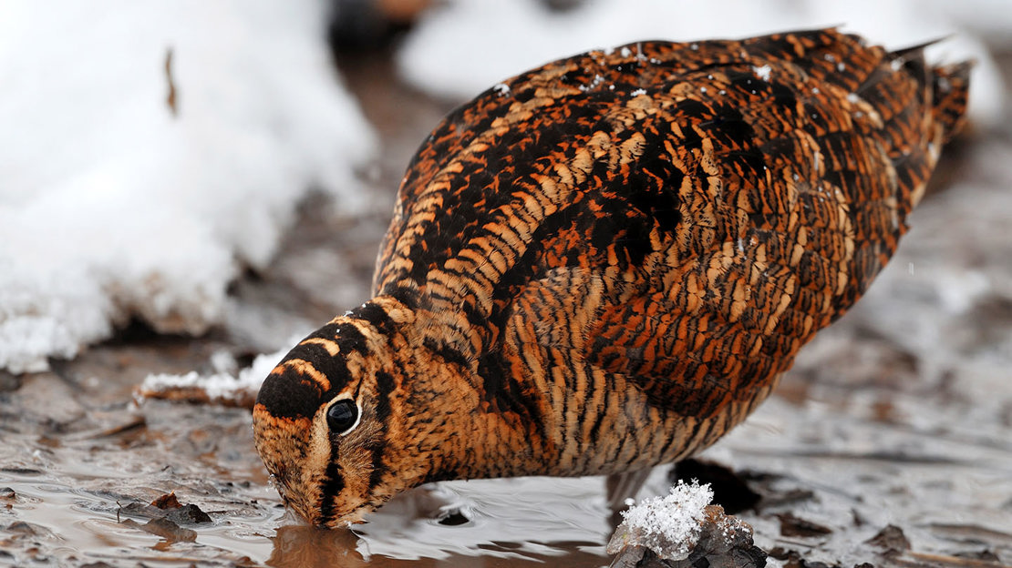 The woodcock’s diet is made up of invertebrates. It eats spiders, earthworms, beetles and snails, which it wanders the woodland floor in search of.