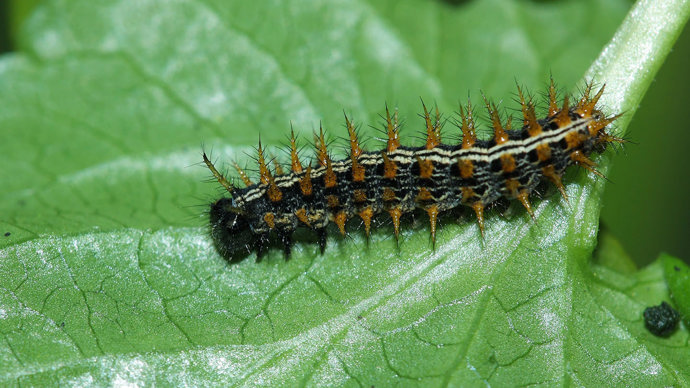 Caterpillars: black-brown with two pale lines along back and long, reddish-brown spines.