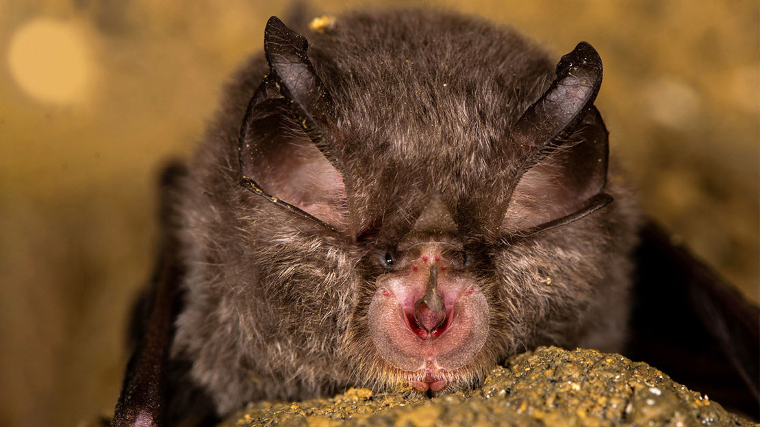 One of the smallest bats in the UK, the lesser horseshoe is roughly the same size as a plum when its wings are tucked in. It has greyish brown fur with a paler underside and a pink face. Like its cousin, the greater horseshoe bat, it has a fleshy, horseshoe-shaped nose leaf. Its ears are large, triangular and have a sharp point.