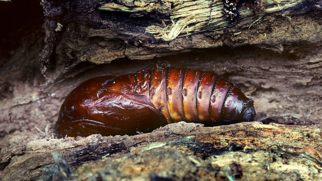 Larvae: the larva is very large, growing up to 10cm long. It is dark red with lighter orangey sides and a black head.