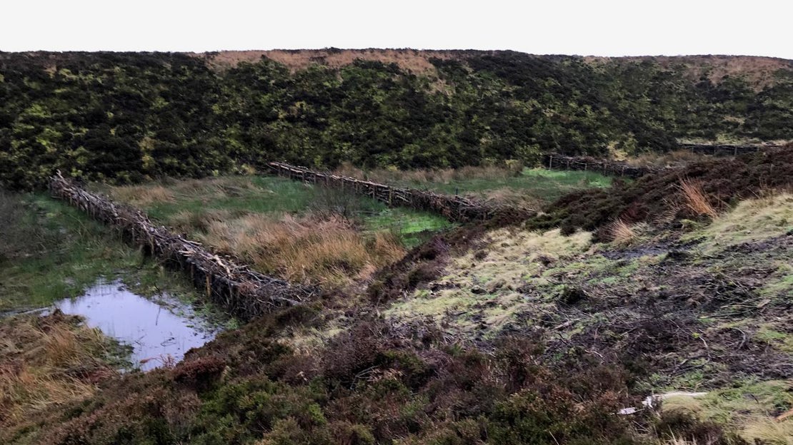 One of the measures is leaky dams, which have been placed in strategic locations across the uplands. They are made of log piles each placed further down than the last, creating a stepped landscape. As the water fills each step and slowly filters through the gaps between the logs, it slows the flow and soaks up the water.