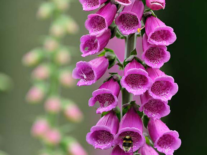 The origins of the name foxglove are unclear, but can be traced all the way back to the Anglo-Saxon period. It’s thought the ‘glove’ part of the name is simply due to the flowers looking like glove fingers. Less certain is the connection to foxes. One theory is that people believed foxes wore the flowers on their paws to silence their movements when hunting. Another is that the flower is often found growing close to the earths where foxes raise their young.