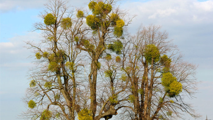 Mistletoe is a small semi-parasitic evergreen shrub which forms large spherical balls up to 1m wide in the tops of trees. Mistletoe leaves, stems and berries are all poisonous.
