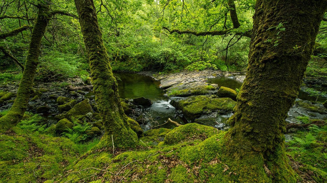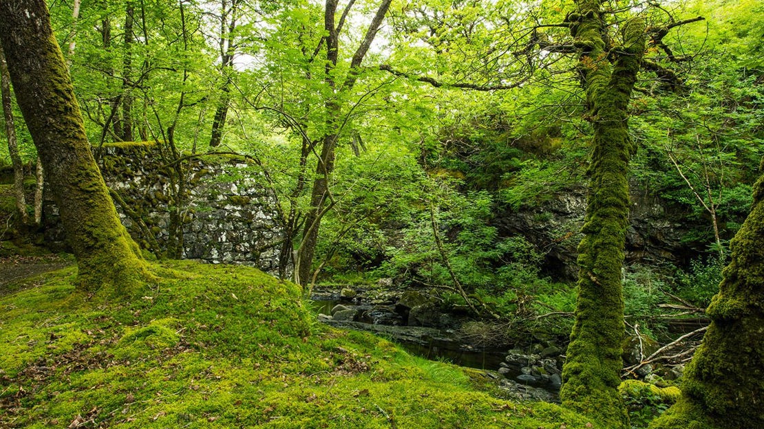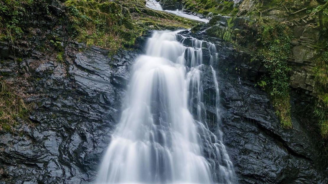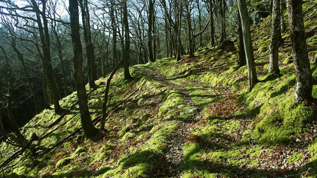 The main entrance is at the lower end of the woodland where a double gate is located. From here, a footpath loop follows the valley of the Ceunant Llennyrch, starting fairly wide and level but becoming steeper as it rises towards the waterfall at the eastern end of the wood.